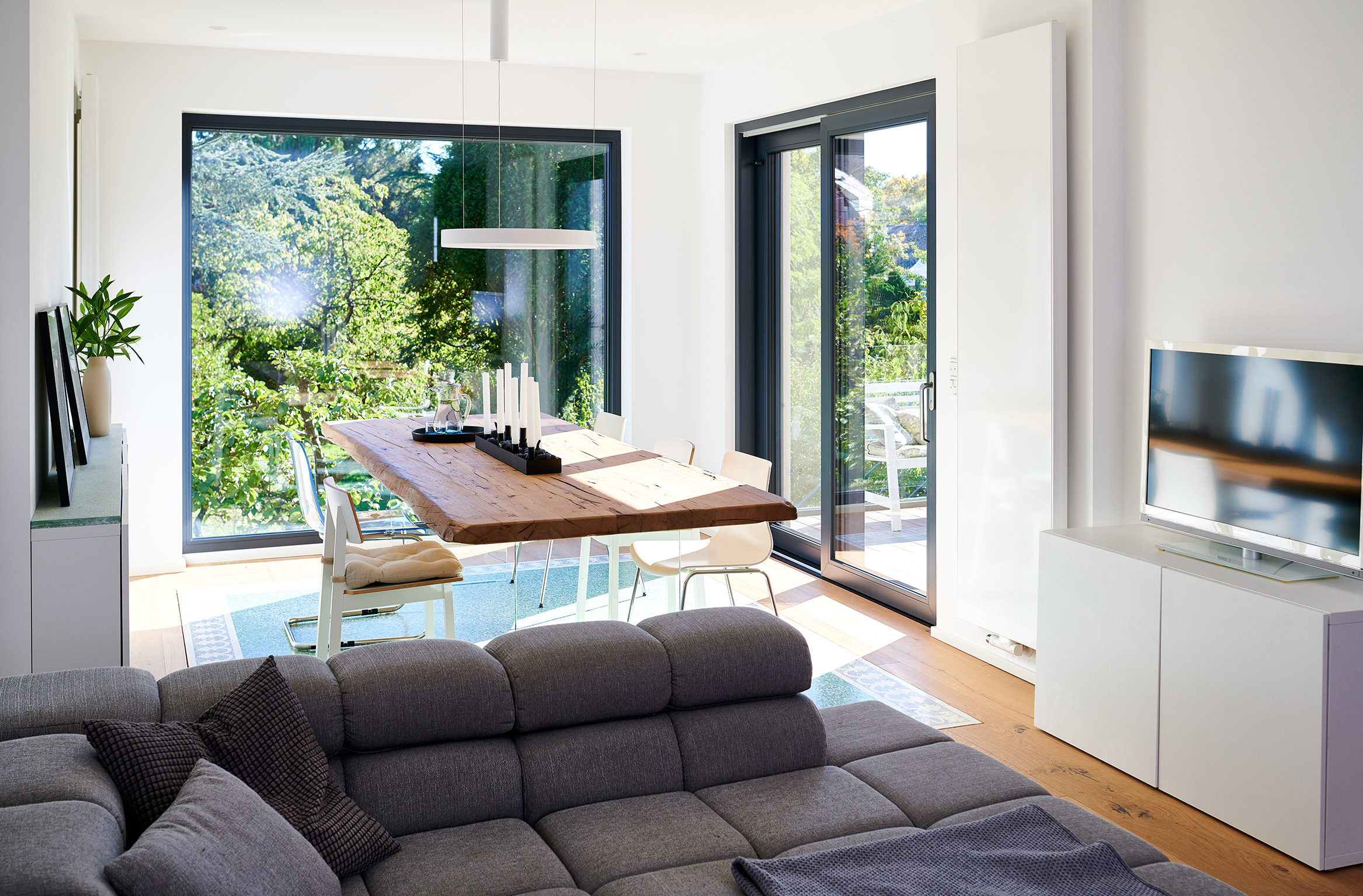 Für die Bauherren war es sehr wichtig, ihr neues Heim so offen wie möglich zu gestalten. Dies gelingt ihnen auch dank der Schüco Fenster, Türen und Schiebetüren.