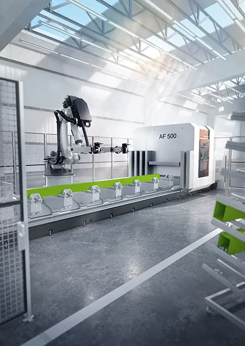 Die Robotertechnologie ist perfekt an die Schüco Maschine AF 500 angepasst und optimiert den Fertigungsprozess für eine schnelle, effiziente und qualitativ hochwertige Fertigung.