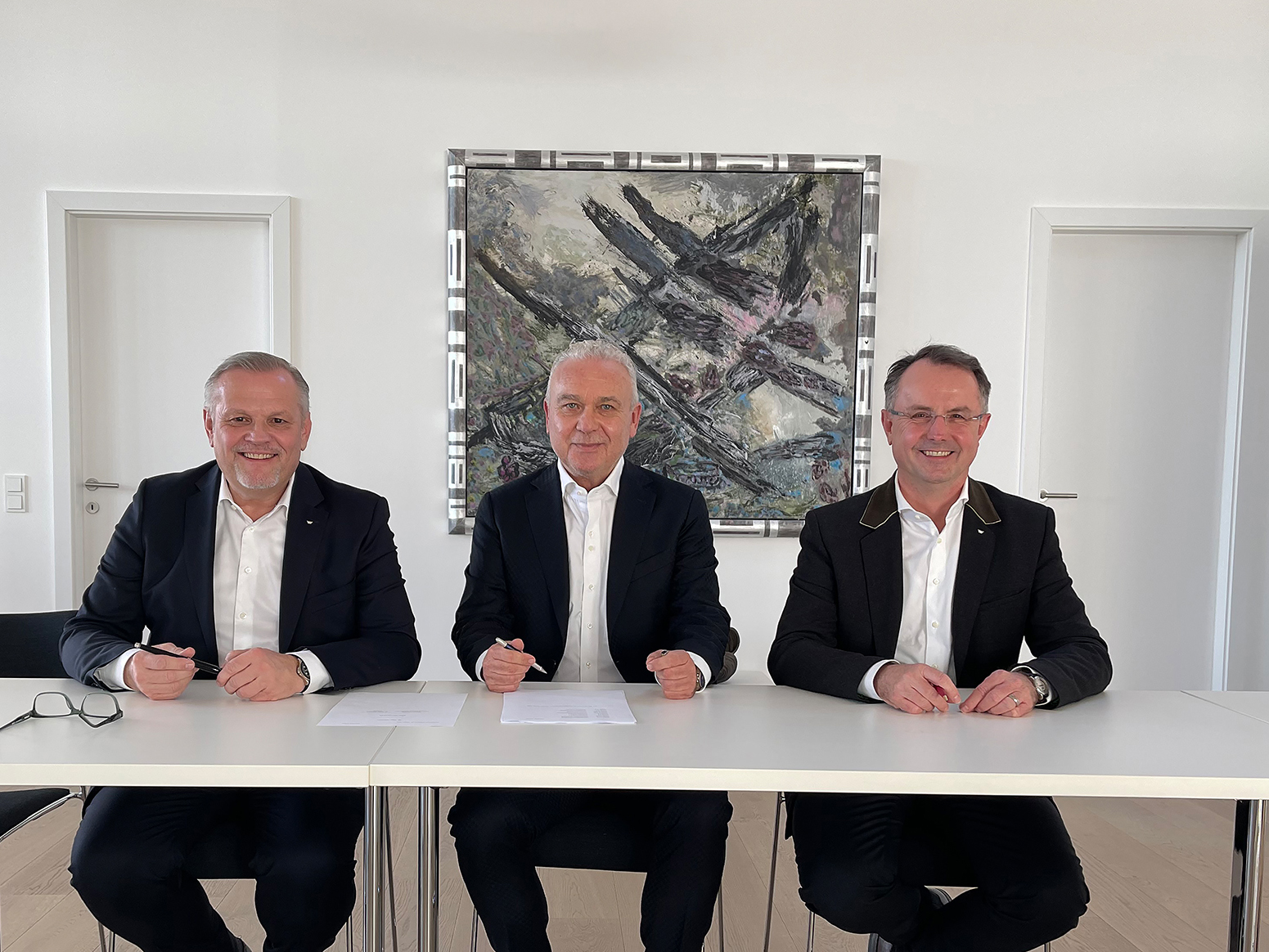 Vertragsunterzeichnung (v. l. n. r.): Andreas Engelhardt, persönlich haftender Gesellschafter der Schüco International KG; Edgar Stemeseder, Geschäftsführer der Stemeseder Gruppe; Dr. Walter Stadlbauer, CTO/COO der Schüco International KG.