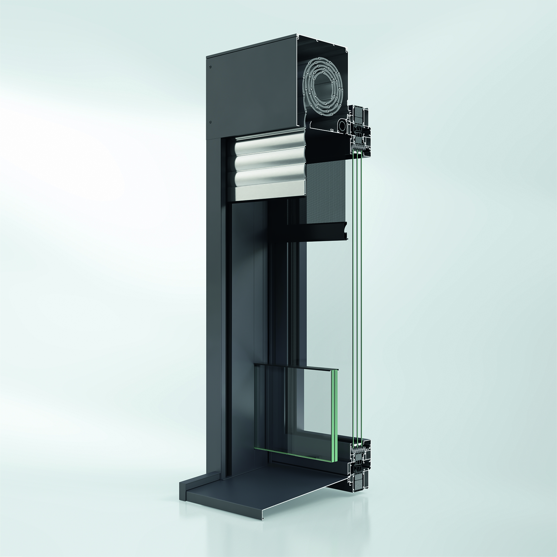 Querschnitt Schüco Perfect Modul mit Designfensterbank, Absturzsicherung, Insektenschutz und Sonnenschutz.