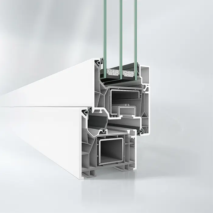 Schüco FocusIng mit Mitteldichtung besitzt dank der drei umlaufenden Dichtungsebenen eine hervorragende Wärmedämmung von Uf = 1,0 W/(m²K) und einen Uw-Wert kleiner 0,80 W/(m2K) bei entsprechender Dreifachverglasung.