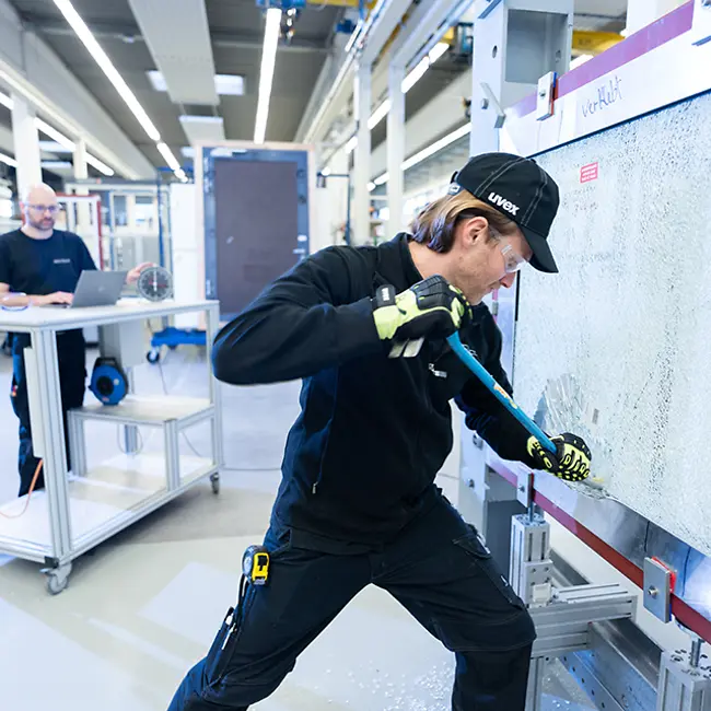 Über 1.200 Prüfungen – auch zu Sonderkonstruktionen – werden im Technology Center jedes Jahr durchgeführt. Um das über Jahrzehnte aufgebaute Wissen im Bereich Fenster und Fassaden weiterzugeben, kooperiert das Technology Center mit den Young Talents von Schüco mit einer 650 Quadratmeter großen Ausbildungswerkstatt für Dual-Studierende.