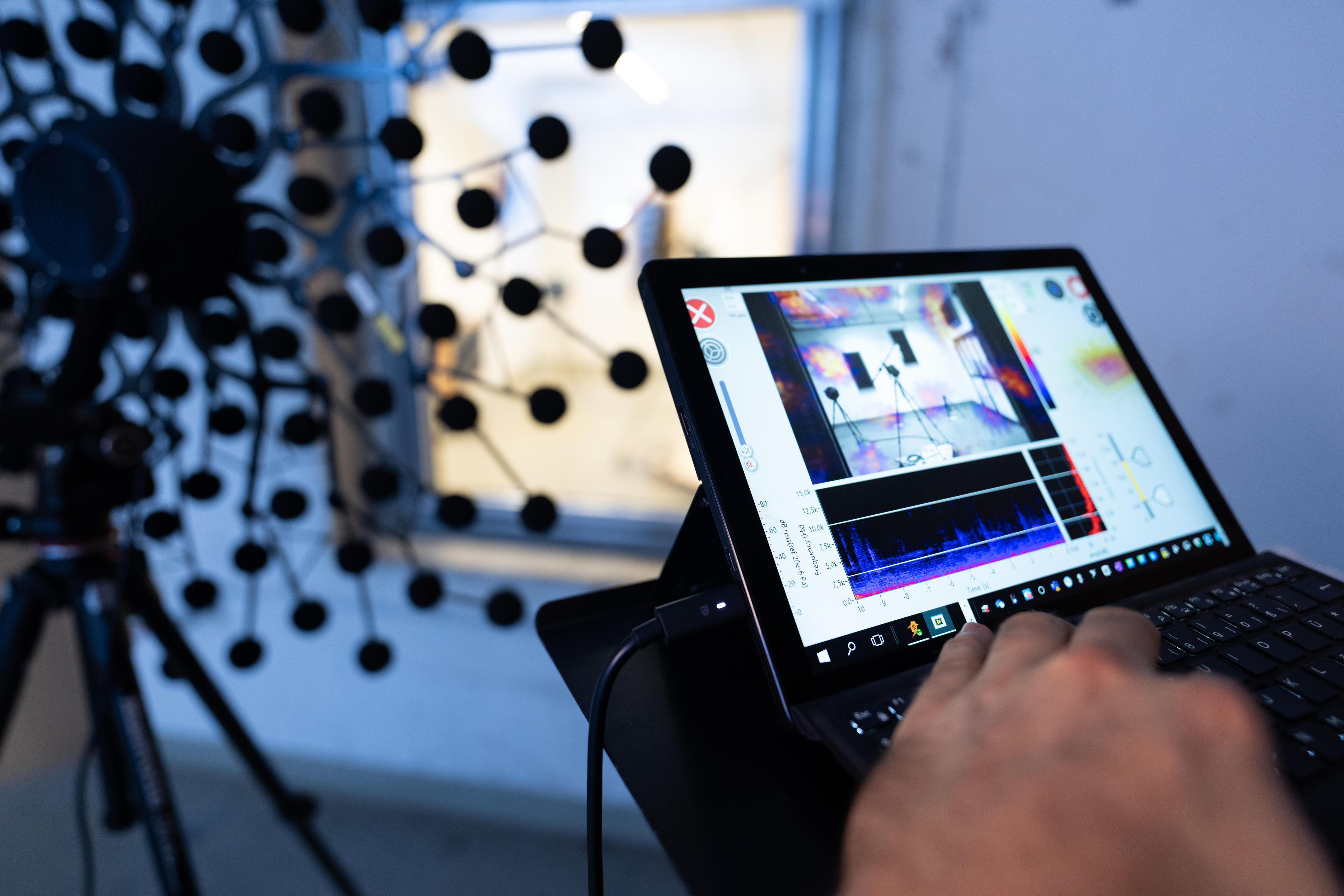 Die akustische Kamera ist ein vielseitiges Gerät. Schallwellen werden verwendet, um ein Bild von der Umgebung zu erzeugen. Eine herkömmliche Kamera verwendet Licht, um Bilder aufzunehmen. Bei der akustischen Kamera werden Schallwellen in visuelle Daten umgewandelt. Dies ermöglicht es, Schallquellen sichtbar zu machen und so zum Beispiel Undichtigkeiten an Gebäudehüllen oder Maschinen aufzuspüren.