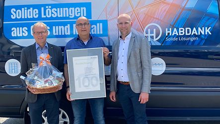Ein Jahrhundert erfolgreich am Markt: Aus diesem Anlass gratulierten Markus Stangl (Schüco Vertriebsleiter Baden-Württemberg, rechts) und Lothar Schneider (Schüco Gebietsmanager und stellvertretender Vertriebsleiter Baden-Württemberg, links) dem Inhaber Martin Habdank sehr herzlich und überreichten eine Urkunde sowie einen Präsentkorb.
