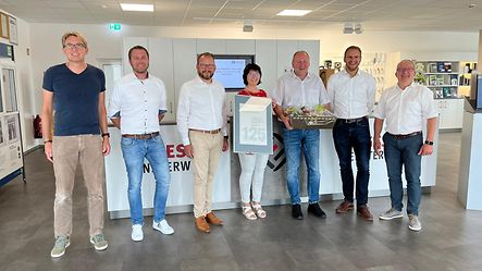 Die Schüco Mitarbeiter überreichten Ende Juli 2022 mit Freude die Auszeichung zum Jubiläum – auf dem Foto sind zu sehen (von links): Martin Pfänder aus dem Vertrieb von Engeser, Schüco Gebietsmanager Thorsten Günzel, Schüco Vertriebsleiter Stephan Schubert, Michaela Engeser, Walter Engeser, Schüco Gebietsmanager Joachim Schmid und Schüco Fachberater Fassadentechnik Ulrich Dörflinger.