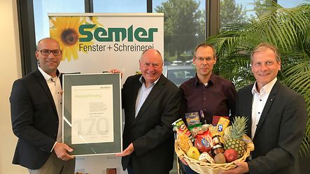 Das Unternehmen arbeitet mit Schüco in den Bereichen Metallbau und Kunststoff-Fensterbau zusammen. Anlässlich des Jubiläums bedankten sich Markus Stangl, Schüco Vertriebsleitung Metallbau Baden-Württemberg (li.), und Lothar Schneider (Gebietsmanager und stellvertretender Vertriebsleiter Baden-Württemberg (re.), bei Max und Martin Semler für die langjährige Zusammenarbeit. Das Schüco Team überreichte eine Auszeichnung und einen Geschenkkorb.
