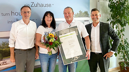 Im Mai 1994 gegründet, hat die SAB GmbH & Co. KG, Putzbrunn, in diesem Jahr 25 Jahre Bestehen gefeiert. Jürgen Bohmann, Schüco Gebietsmanager (links) und Alexander Kurz, Schüco Vertriebsleiter Metallbau Bayern (rechts) gratulierten Monika Palesch und Detlef Palesch, Geschäftsführer und Inhaber der SAB, herzlich. Sie überreichten Blumen und die Auszeichnung. SAB steht übrigens für „Service und Fertigung von automatischen Türanlagen und Bauelementen”.