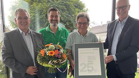 Als kompetenter und innovativer Fachbetrieb ist die SW Metallbau GmbH über 25 Jahre erfolgreich in der Metallbaubranche tätig. Zum Jübiläum gratulierten Schüco Gebietsmanager Christoph Müller und Vertriebsleiter Stephan Kutsch herzlich (jeweils außen von links) den Geschäftsführern Ralf Thorn und Klaus Jürgen Wenig (2. und 3. von links).