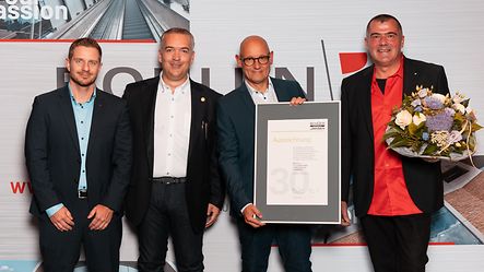 Das Schüco-Team bedankt sich für viele Jahre erfolgreicher Zusammenarbeit, überreicht den Geschäftsführern Hans-Peter Bohlen und Jürgen Dietzen anlässlich des Jubiläums eine Urkunde und wünscht alles Gute.