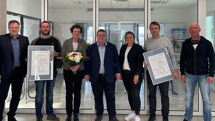 Über die langjährige Zusammenarbeit freuen sich (von links): Dietmar Ruwisch, Gebietsmanager Kunststoff von Schüco, Matthias Korts, TFTT Produktionsleiter Aluminium, Birgit Korts, TFTT Prokuristin, Torsten Beckmann, TFTT Geschäftsführer, Annabell Diekmann, Schüco Gebietsmanagerin Metallbau, Sebastian Schulz, TFTT Leiter Innendienst Kunststoff und Christian Korts, TFTT Teamleiter Produktion Kunststoff. Herzlichen Glückwunsch!