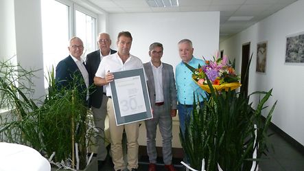 1991 gegründet, feiert uniplast GmbH Bauteile 30 Jahre erfolgreiches Bestehen am Markt. Christoph Weiss (v. li.), Prokurist und stellvertretender Geschäftsführer Vertrieb, Udo Bots, Schüco Gebietsmanager, Inhaber André Maisack, Christian Schneider, Technischer Geschäftsführer und Andreas Jung, Firmengründer, kamen anlässlich des Jubiläums in Maßweiler unter Berücksichtigung der Pandemie-Vorgaben zusammen. Das Schüco Team gratulierte herzlich mit einem Blumenstrauß und überreichte die Urkunde.
