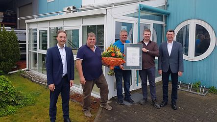 Schüco Vertriebsleiter Thorsten Klöckner (li.) und Schüco Gebietsmanager Alexander Teich (re.) gratulierten zum Jubiläum und nahmen die Geschäftsführer Roland Schäfer und Uwe Schäfer sowie Kay Schäfer in die Mitte (v. li.). Sie freuten sich über die Urkunde und den Blumenstrauß.