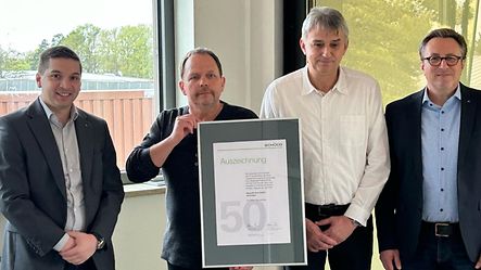 Das Foto zeigt von links nach rechts: Alex Solodki (Fa. Schüco, Gebietsmanager Stahl), Torsten Volck und Karsten Sorgatz (Geschäftsführer Fa. Bauprofil Koch), Dirk Hackel (Fa. Schüco, Gebietsmanager Metallbau Alu).