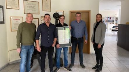 Sie bilden ein starkes Team und präsentieren die Jubiläumsurkunde: Andreas Erb, Norman Erb, Jonas Erb, Thomas Erb und Katrin Scaroni (v. re.)