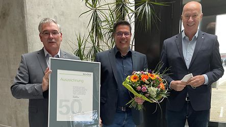 Seit fast 50 Jahren ist das Unternehmen zudem Schüco Partner. Anlässlich des Jubiläums überreichten Schüco Gebietsmanager Christoph Müller und Vertriebsleiter Stephan Kutsch (außen von links) Geschäftsführer Markus Noll eine Auszeichnung sowie Blumen.