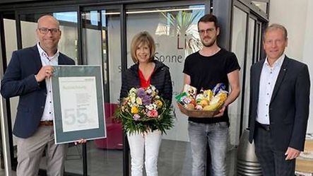 Zum 55. Jahr der Partnerschaft gratulierten Markus Stangl (Schüco Verkaufsleiter Baden-Württemberg, li.) und Lothar Schneider (Gebietsmanager und stellvertretender Vertriebsleiter Baden-Württemberg) der Inhaberin Andrea Wiedemann und Sohn Marc Beuther. Das Schüco Team überreichte als Anerkennung eine Urkunde, samt Blumenstrauß und Geschenkkorb.