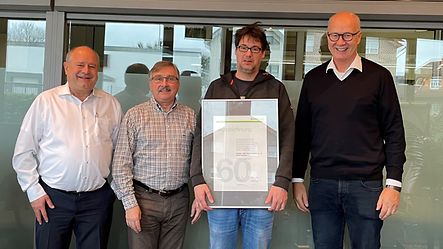 Anlässlich des Jubiläums bedanken sich Verkaufsleiter Stephan Kusch (rechts) und Gebietsmanager Günther Beginn (links) für die langjährige Partnerschaft und gratulieren dem Gesellschafter und Geschäftsführer Jean-Paul Schuler (2. von rechts) und Geschäftsführer Volker Leigdschwender (2.von links).