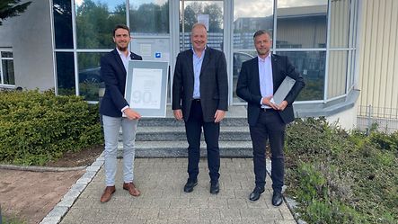 Bereits seit 1931 setzt sich die Firma Schweiker für technisch fortschrittliche Produkte und hohe Qualität ein. Jetzt begeht das Unternehmen sein 90. Jubiläum. Florian Schmidt, Schüco Gebietsmanager Metallbau (li.), und Henrik Brinkmann, Vertriebsleiter Schüco Polymer Technologies KG (re.), gratulieren Stephan Schweiker (Mitte) herzlich.