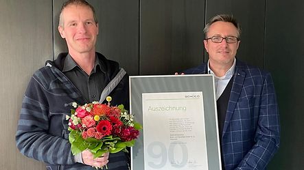 Den Betrieb hatte Adolf Schwonberg, Schlossermeister, am 1. März 1932 als Firma Adolf Schwonberg, Kunst-und Bauschlosserei, gegründet. 90 Jahre später hat das Unternehmen Adolf Schwonberg GmbH & Co. Grund, zu feiern: Anlässlich des Jubiläums überreichte Schüco Gebietsmanager Dirk Hackel (rechts) Geschäftsführer Helfried Schwonberg Blumen und die Urkunde. Herzlichen Glückwunsch!