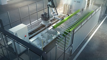 Zwei Greifbacken können ein Profil um 180 Grad drehen. Eine eventuell benötigte zweite Spannlage ist kein Problem. Abgearbeitete Stäbe versieht der Roboter mit einem Etikett und entlädt sie zurück ins Regal. Alle Zuschnitte aus einer Stange werden auf einer Ebene abgelegt. Sind alle Fertigteile einer Stange entnommen, reinigt eine Blasdüse am Greifer die Spannböcke mit einem kontrollierten Luftstoß. Störungen zeigt die CAM per E-Mail an. Die Technologie ist auch an einer bereits vorhandenen AF 500 nachrüstbar.