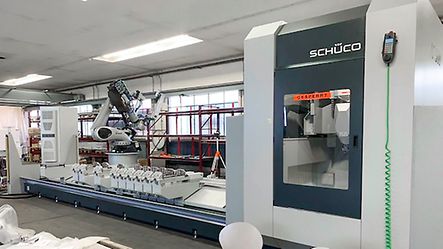 Den ersten Schritt in Richtung Robotik im Handwerk macht die Kombination aus Bearbeitungszentrum und Roboter. Schüco kooperiert hier seit vergangenem Jahr mit dem Roboter-Spezialisten KUKA. Die neueste KUKA Robotertechnologie, Quantec Ultra, erweitert die Schüco AF 500 durch eine Be- und Entladeeinheit. Die Automatikzelle kann ohne Bediener problemlos alle Profile mit der maximalen Dimension 200 mal 140 Millimeter vollautomatisch bearbeiten und zuschneiden.