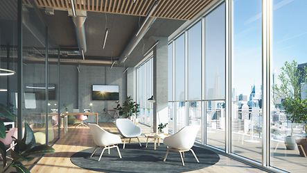 Kaum zu sehen: Der Schüco Integralmaster realisiert im Fassadensystem FWS 50/60 integrierte Sonnen-, Blend- sowie Sichtschutz-Lösungen.