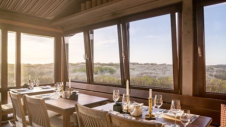 Filigrane, großflächige Fensterprofile aus Aluminium ermöglichen einen ungehinderten Ausblick auf die schöne Küsten- und Dünenlandschaft der Nordseeinsel Sylt.