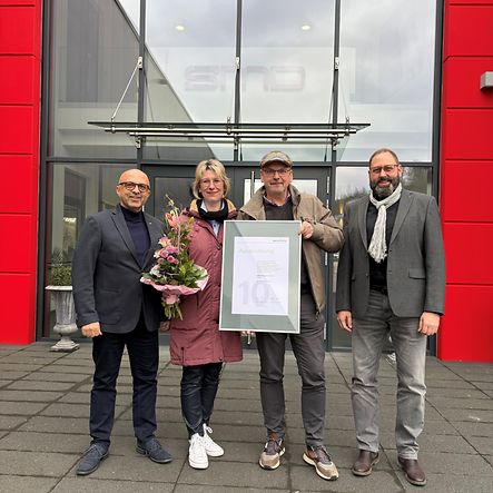 Mit großer Freude gratulieren wir der SMD Konstruktion aus Siegen zu ihrem 10-jährigen Jubiläum als geschätzter Schüco Partner! Zu diesem besonderen Anlass haben der Schüco Gebietsmanager Fotios Pappas und der Schüco Fassadenfachberater Sven Hermann dem Geschäftsführer Ralf Müller und der technischen Leiterin Bianca Setzer persönlich gratuliert und eine Schüco Jubiläumsurkunde überreicht.