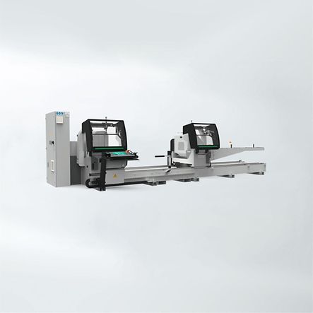 Die flexible Doppelgehrungssäge enthält horizontal austretende 500er-Sägeblätter für den Schnitt von Aluminiumprofilen. Ein Servomotor ermöglicht das stufenlose Neigen der Sägeköpfe in hoher Geschwindigkeit und die menügeführte Bedienung ergänzt die einfache Handhabung bei geringen Arbeitshöhen.