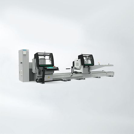 Die flexible Doppelgehrungssäge enthält horizontal austretende 600er-Sägeblätter für den Schnitt von Aluminiumprofilen. Ein Servomotor ermöglicht das stufenlose Neigen der Sägeköpfe in hoher Geschwindigkeit und die menügeführte Bedienung ergänzt die einfache Handhabung bei geringen Arbeitshöhen.