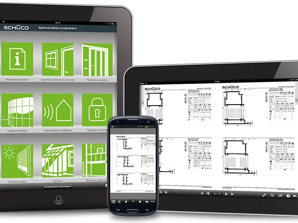 Mit der App „Docu Center“ bietet Schüco seinen Partnern und Architekten einen mobilen Zugriff auf alle technischen Dokumentationen. Übersichtlich in einem Kiosk nach Produktkategorien sortiert, sind sämtliche Dokumentationen ganz einfach auf dem iPad verfügbar - auch unterwegs.