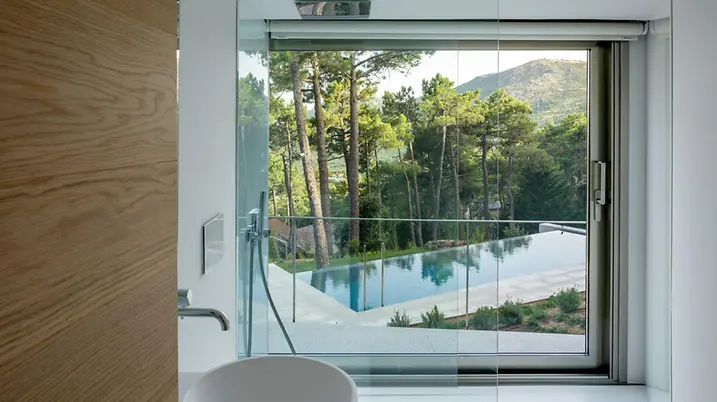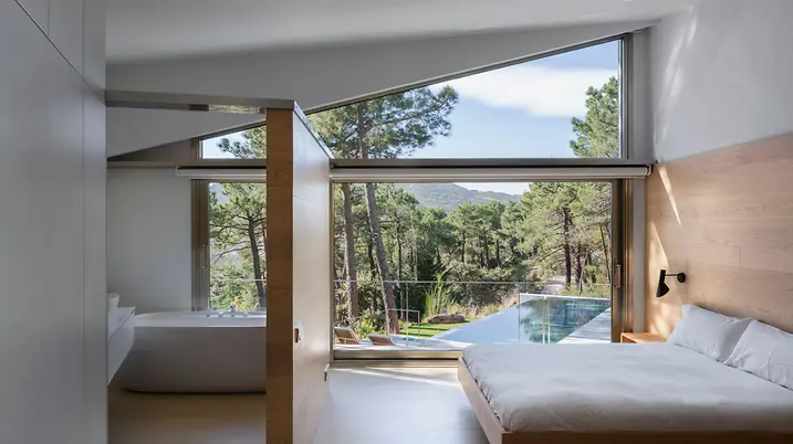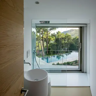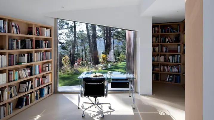 Das Erdgeschoss – zugleich der Hauptwohnbereich – wird durch den Eingang in eine Tages- und eine Nachtzone unterteilt: Der Nachtbereich verfügt über vier Schlafzimmer. Die Tageszone beherbergt die Küche, den Wohn- und Essbereich sowie die Bibliothek, die am höchsten Punkt des Gebäudes liegt. Neben der Waschküche und den Hauswirtschaftsräumen befinden sich im unteren Geschoss des Gebäudes ein Büro, ein Spielzimmer, eine Werkstatt und ein Gästezimmer mit Bad. Durch die besondere Komposition und die Einbettung der Wohnwürfel entlang des Hangs können Hausbewohner und Gäste selbst hier, im eigentlichen Souterrain, die schönen Ausblicke in alle Richtungen genießen.