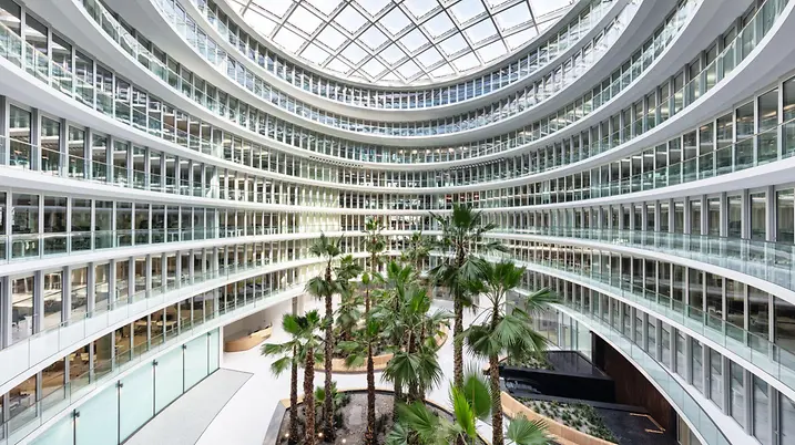 Das Deutschlandhaus beeindruckt durch seine markante Fassade aus stilbildendem Rotklinker, die in vertikalen Verbänden gestaltet ist. Klare Linien und der Einsatz von Stein und Glas verleihen dem Gebäude eine zeitlose Eleganz. Oberirdisch erstreckt sich die Gesamtfläche über rund 40.000 m2, davon entfallen etwa 29.000 m2 auf moderne Büroflächen. Ergänzt werden diese durch rund 30 exklusive Wohnungen am Valentinskamp sowie ansprechende Einzelhandelsflächen mit Gastronomie im Erdgeschoss. Im Inneren schafft ein lichtdurchflutetes Atrium mit ellipsoidem Grundriss eine Oase der Ruhe und Kreativität, während die umlaufenden Wasserbecken und Terrassen vielfältige Nutzungsmöglichkeiten bieten.