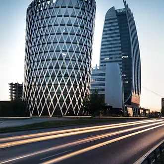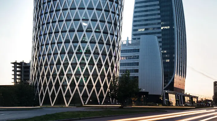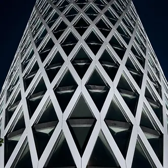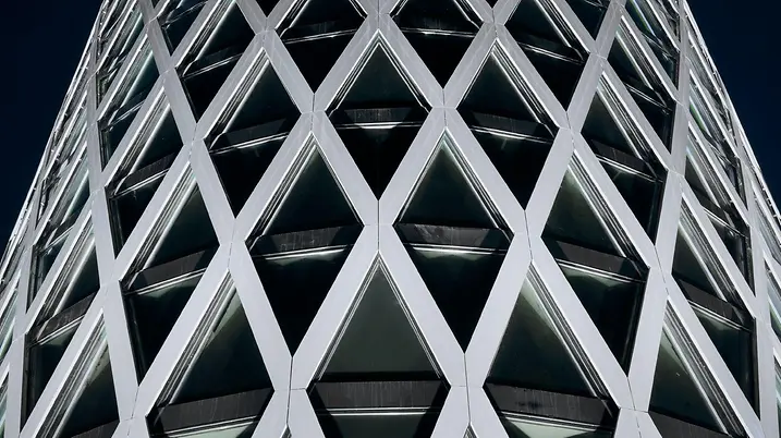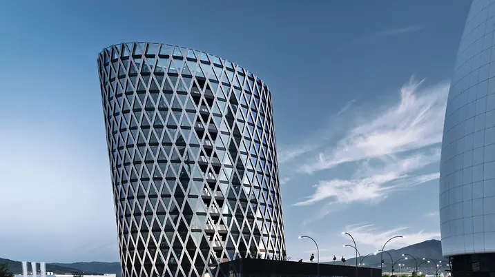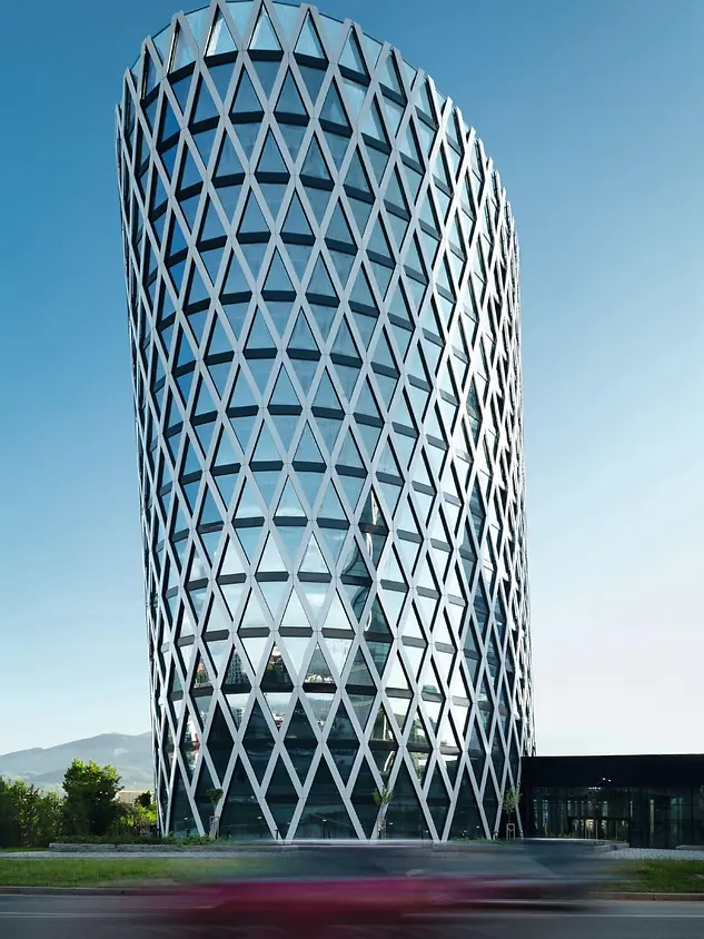 Das Ellipse Center vereint Büro- und Einzelhandelsflächen unter einem architektonisch markanten Hüllenkonzept. Der Entwurf, inspiriert vom Schiefen Turm von Pisa, besteht aus einem rautenförmigen Fassadennetz, in das dreieckige Fenster gesetzt wurden. Dies verleiht dem Gebäude seine charakteristische Dynamik. Zugleich erfüllt die Gebäudehülle höchste Anforderungen an Energieeffizienz – unter anderem durch hochwärmegedämmte Fenster- und Fassadenelemente von Schüco.
