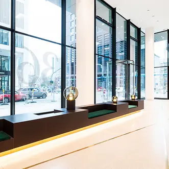 Eine besondere Herausforderung für Planer und Verarbeiter stellte die unter Denkmalschutz stehende Glas-Metall-Fassade dar. Sie sollte einerseits ihr Erscheinungsbild behalten, andererseits den neuesten technischen Anforderungen gerecht werden. Eine eingehende Analyse zeigte schließlich, dass die Ertüchtigung der bestehenden Fassade weder thermisch noch hinsichtlich weiterer Parameter möglich gewesen wäre. Auf Basis des Systems USC 65 von Schüco wurde daher eine neue Fassadenlösung entwickelt, die die Materialität, die Farbigkeit und die Proportionen des Bestandes aufnahm. 11.560 m² Elementfassade USC 65 wurden als Sonderkonstruktion verbaut, außerdem 790 m² Pfosten-Riegel-Fassade FW 50 von Schüco.