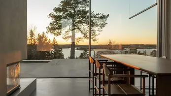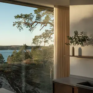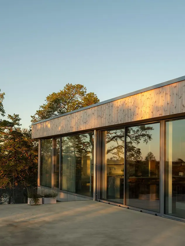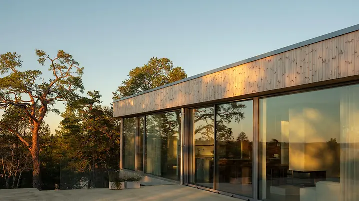Inspiriert von seinen Reisen wünschte sich das Paar für das gemeinsame Zuhause einen internationaleren Architekturstil. Sie entschieden sich für einen Neubau. Das Grundstück auf dem Gipfel eines Hügels in Värmdö bot ideale Voraussetzungen: die nötige Privatsphäre, einen atemberaubenden Blick auf den Archipel, Heimatgefühle. Dank des in den Felsen eingelassenen Betonsockels verschmilzt das Gebäude heute trotz dramatischer Höhenunterschiede mit dem Untergrund, wirkt wie eine Erweiterung seiner Umgebung. Der darüber ruhende Baukörper aus Kiefernholz und Glas spiegelt die Landschaft und übt sich in vornehmer Zurückhaltung inmitten des sensiblen Naturgebietes.