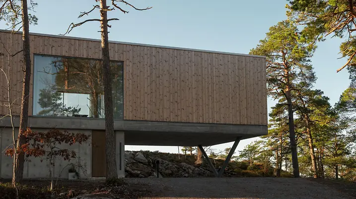 Inmitten des Stockholmer Schärengartens, zwischen schroffen Klippen und majestätischen, vom Wind gepeitschten Kiefern, fügt sich das Haus mit seinem streng geometrischen Körper scheinbar mühelos in die raue Natur ein. „Darin zeigt sich die Leistung des Architekten“, erzählt Bauherr Jonas Ljung. Denn der bekannte Magier und seine Partnerin Evelina Björninen waren überrascht, wie oft sie im Planungsprozess von erfahrenen Bauunternehmern hörten: „Das ist unmöglich.“ Glücklicherweise lagen sie falsch.