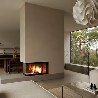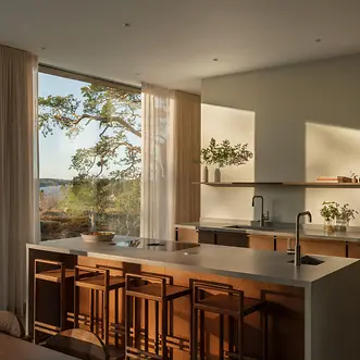 Großzügige Glasflächen und bodentiefe Fenster lassen die Wohnräume optisch nahtlos in die umliegenden Kiefernwälder übergehen und machen einen markanten Baum zum zentralen Bestandteil des Wohnerlebnisses – der Namensgeber der „Pine Edge Villa“. Maßgefertigte Stauraumlösungen wurden elegant in das Interieur integriert, sodass der minimalistische Look erhalten bleibt, ohne auf Funktionalität zu verzichten. Warmes Eichenholz und sanft getönte Wände greifen die Farben der Natur auf und schaffen ein harmonisches Wohngefühl.