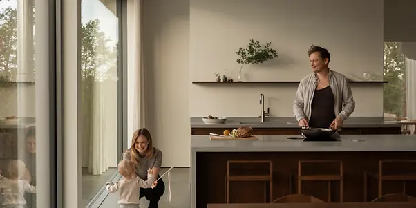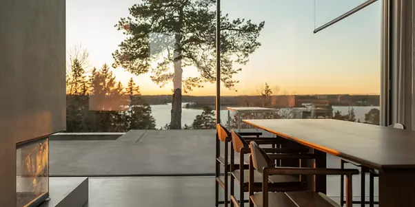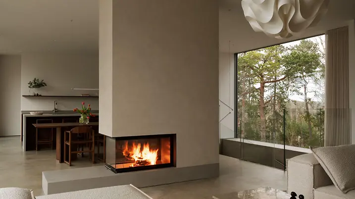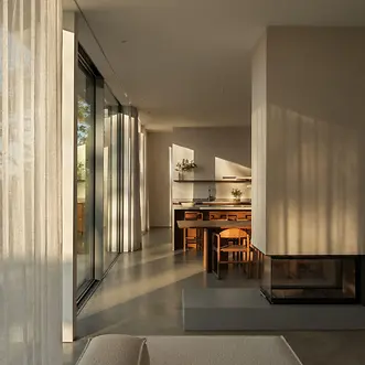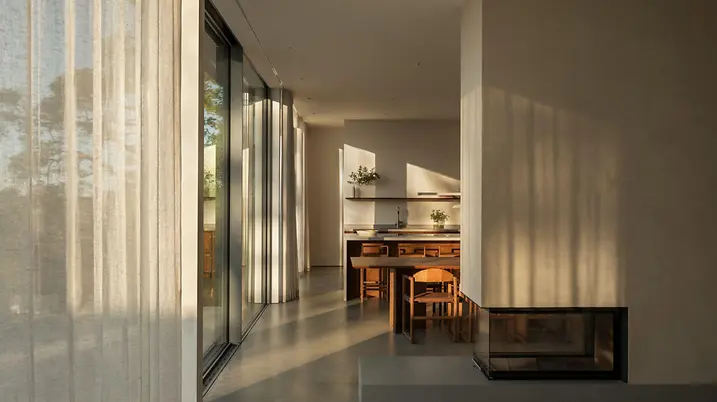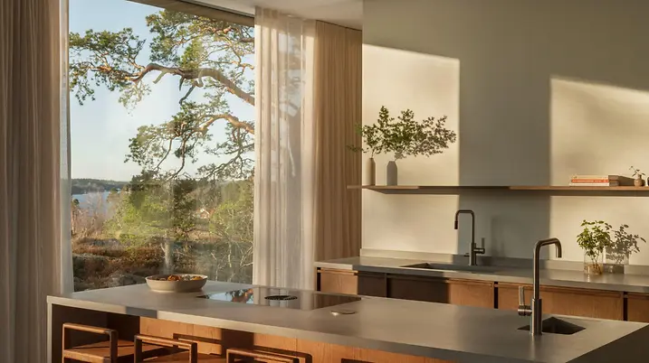Das Design ist inspiriert von den amerikanischen „Case Study Houses“ der späten 50er: Ursprünglich für die Nachkriegs-Mittelschicht konzipiert, wurden die experimentellen Wohnhäuser mit ihren Flachdächern, offenen Grundrissen und nahtlosen Verbindungen von Innen und Außen zu Ikonen ihrer Zeit. Durch eine skandinavische Interpretation und hochwärmegedämmte Fenster- und Schiebetüren wurde das Konzept an das nordische Klima angepasst. So entstand auf 253 m² ein offener, heller Neubau in klarem, minimalistischen Stil. Die Materialpalette wurde bewusst reduziert: Beton, Holz, Kalkstein und Glas betonen die Konzentration auf das Wesentliche.