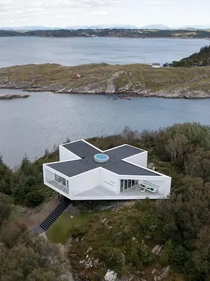 Südlich von Bergen, inmitten eines Archipels, erhebt sich die Villa Austevoll über die Landschaft. Großformatige Fensterfronten und eine Falt Design Schiebetür ermöglichen atemberaubende Ausblicke in die umliegende Natur. Ein rundes Dachfenster öffnet den Blick gen Himmel.