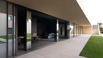 Die Architektur der Villa Colle Allegro versteht sich als zeitgenössischer Eingriff in einen historisch gewachsenen Kontext. Der Entwurf setzt auf eine klare, reduzierte Formensprache, die bewusst mit traditionellen Elementen kontrastiert – ohne diese zu verdrängen. Großformatige Panorama Design Schiebetüren strukturieren die Fassaden, öffnen gezielt Sichtachsen in die toskanische Hügellandschaft und schaffen fließende Übergänge zwischen Innenraum und Natur.