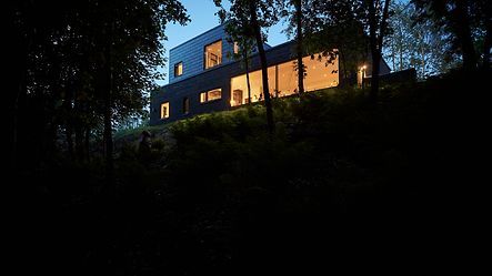 Hvordan sikrer du dig, at du får maksimalt ud af den natur, du har valgt at bosætte dig i? Du indsætter naturligvis et kæmpe vinduesparti fra gulv til loft samt en skydedør på den modsatte side. På den måde kan du nyde alle årstider fra flere verdenshjørner. Dette var også netop tanken bag villaen i Randers på 273 m2, som i samarbejde med bygherren er tegnet af Martin Wienberg fra Friis & Moltke Architects. Her skal hverdagen og naturen nemlig nydes af familien, der består af far, mor og tre børn. At de byggede lige op ad skoven er ingen tilfældighed, for selvom de ønskede at udnytte den fantastiske udsigt over skrænten og ind i skoven, var det også et stort ønske fra familien at være privat.