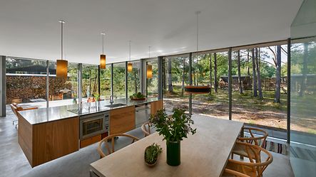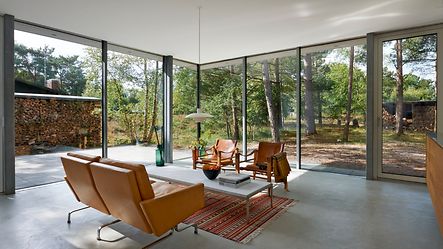 Da husets indehavere begge arbejder i den kreative branche har de i hele processen stillet høje krav til godt design, men også høj funktionalitet. Derfor har det også været vigtigt at vælge funktionelle vinduer og døre, men uden at gå på kompromis med designet. Smalle dør- og vinduesrammer med en fantastisk isolering og som tilmed er meget vedligeholdelsesvenlige har opfyldt dette. Ved stuevinduet er der valgt en løsning med en lav vindueskarm i stedet for glas helt til gulvet, så vinduet nærmest "indrammer" naturen som et levende fotografi.