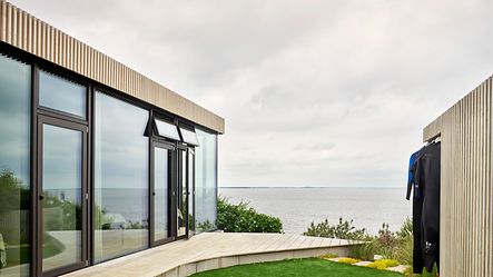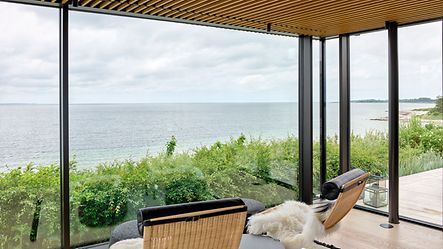 Med den smukke og åbne udsigt ud til stranden var det et essentielt krav, at store glasprofiler og poster kunne indbygges i loft og gulv. Frederik var overbevist om, at der skulle anvendes aluminium Schüco systemer i hele huset.