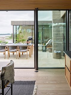 Fællesrummet er Alpha og Omega for familien og der er anvendt en Schüco skydedør ASS 77 PD.HI med Seamless Integration, som giver en flydende overgang mellem facade og skydedør.