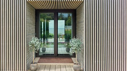 Sommerhuset byder på en flot hovedindgang med en Schüco hoveddør AWS/ADS 75.SI og Schüco facadepartier FWS 50 SI rundt om hele huset.