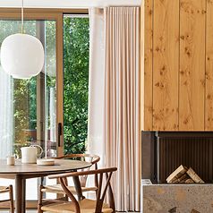 Familien havde en klar vision om, at den smukke omkringliggende natur ude skulle smelte sammen med materialerne inde. Hvilket tydeligt kommer til udtryk i designet og materialevalg igennem hele huset, hvor naturmaterialer og bløde rolige hjørner i form af et unikt buet design er gennemgående elementer. De ønskede et unikt hjem, som skiller sig ud og ikke er det man ser alle steder.