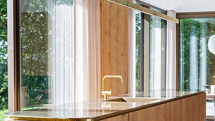 Køkkenet er familiens yndlingssted i huset, da det er hjertet af huset og der er blevet tænkt i at man kan se 290 grader rundt om huset gennem de store vinduespartier og skydedøre.