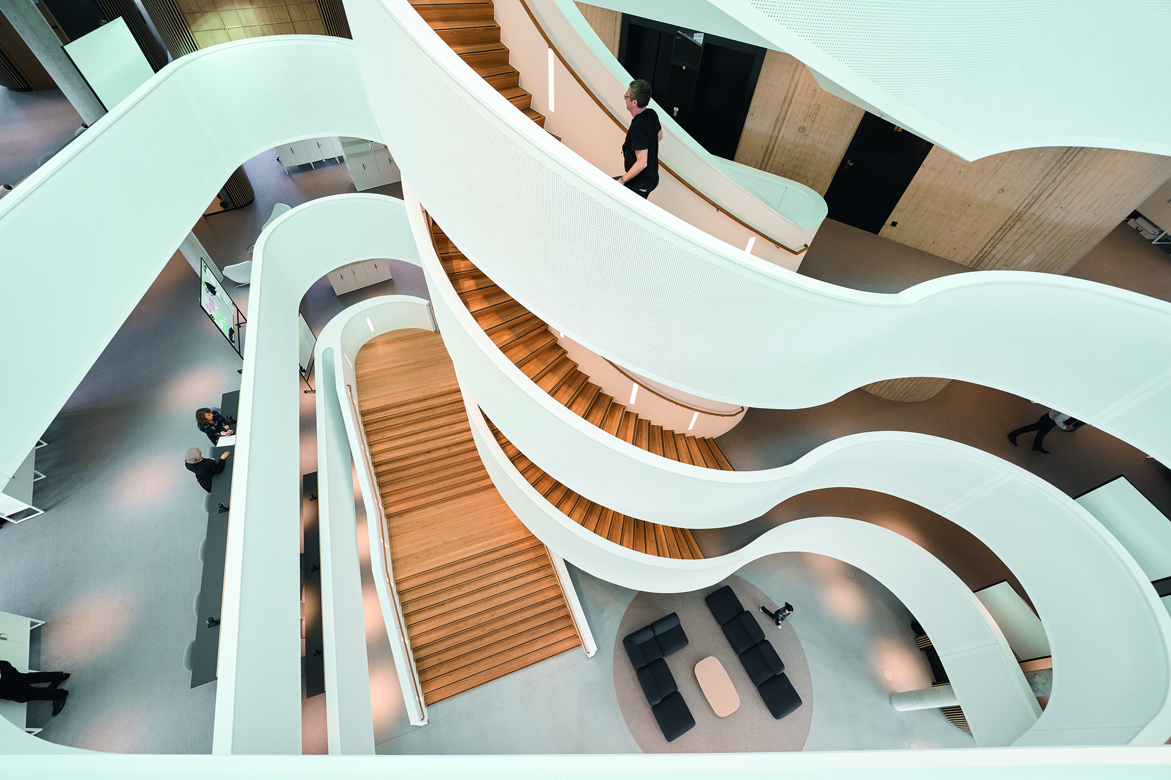 Meeting place: the welcoming entrance area with its wide staircase invites people to communicate and share their knowledge with one another.