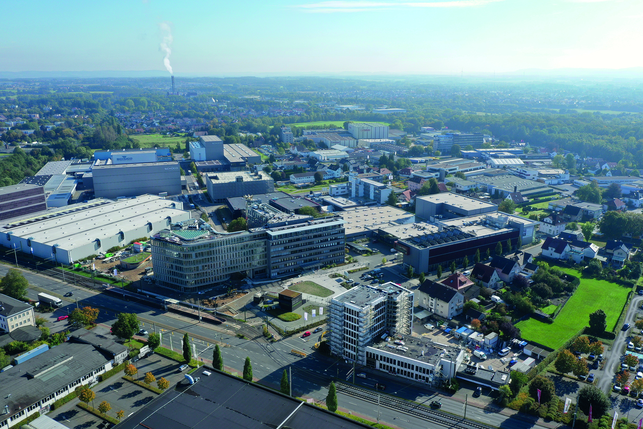The Schüco Campus in Bielefeld with the Schüco One newbuild, the new Schüco Welcome Forum and the renovated Schüco Corporate Services building.